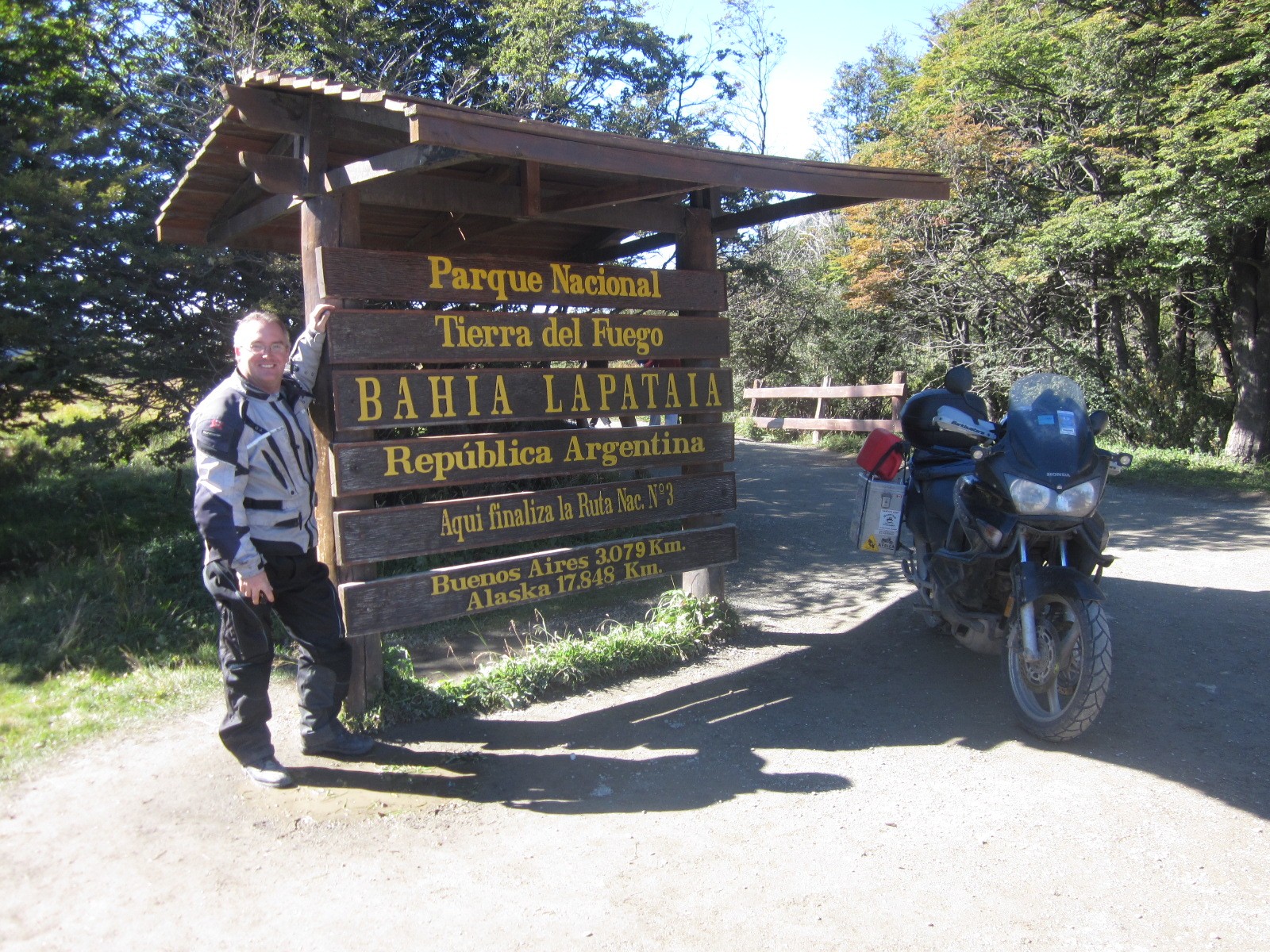 Greg, very good. Congratulations on arriving in Ushuaia, Tierra del Fuego, Argentina. You have now ridden as far south on public roads as you can go anyplace in the World, not many people can say that. Another milestone reached. I know you have that good feeling deep within yourself. From the picture at the sign at Bahia Lapataia Park it looks like the weather was pretty nice. Take sometime to see the local sites. I only spent two & a half days there after arriving & some of that time was spent doing some maintenance on the moto. I wished I had hung around longer, but it was April, the beginning of winter & the weather was nasty. Snowed the night before I left. I congratulate you on the great adventure you are having. Pete Chester
